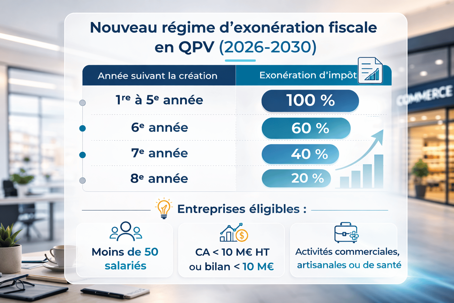 Les entreprises qui créent ou reprennent une activité en QPV entre le 1er janvier 2026 et le 31 décembre 2030 bénéficieront d’un régime d’exonération dégressive d’impôt sur les bénéfices.