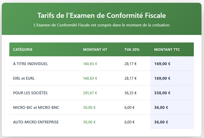 Tarifs Cotisations L’Examen de Conformité Fiscale est compris dans le montant de la cotisation Une question ? Contactez un conseiller En cas de changement de forme d’activité, sur une année civile donnée, la cotisation est dûe.